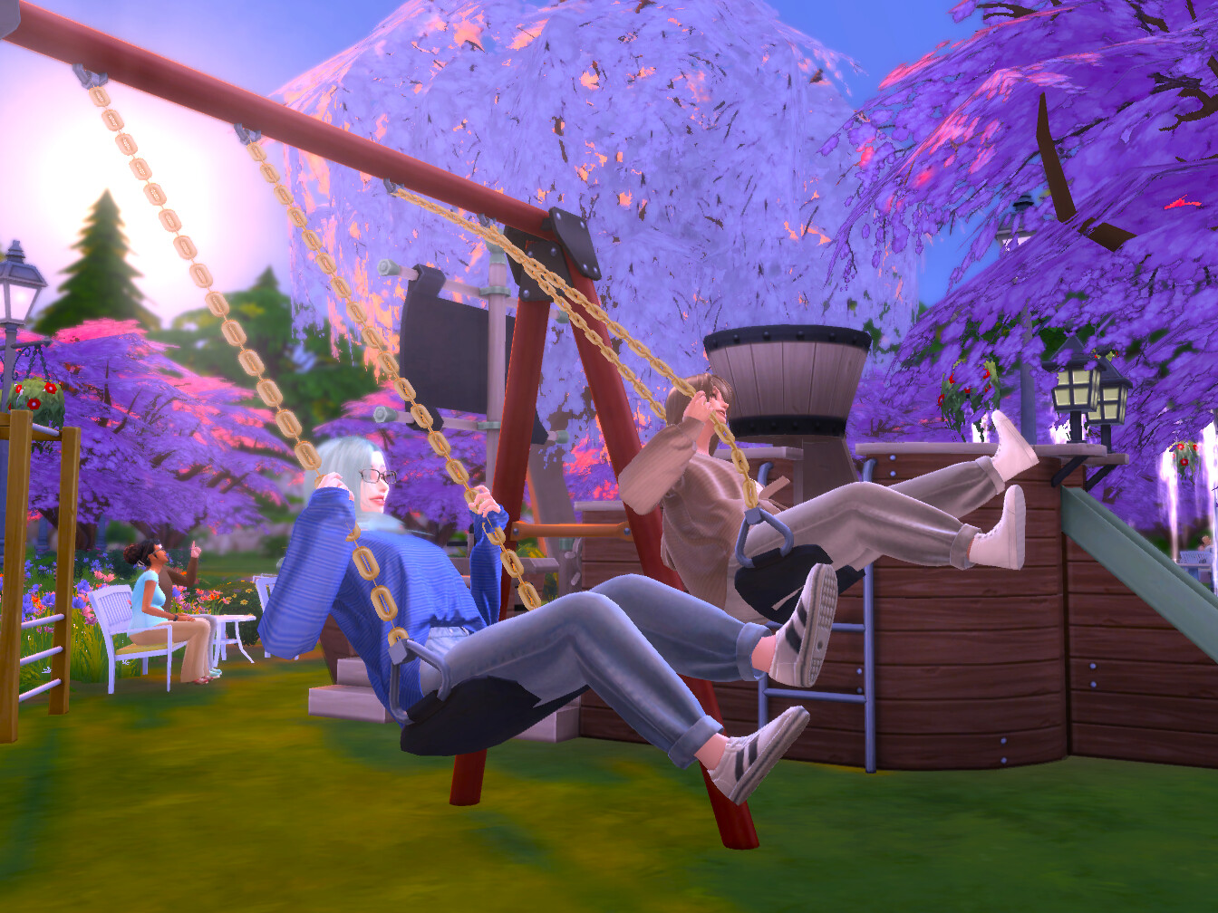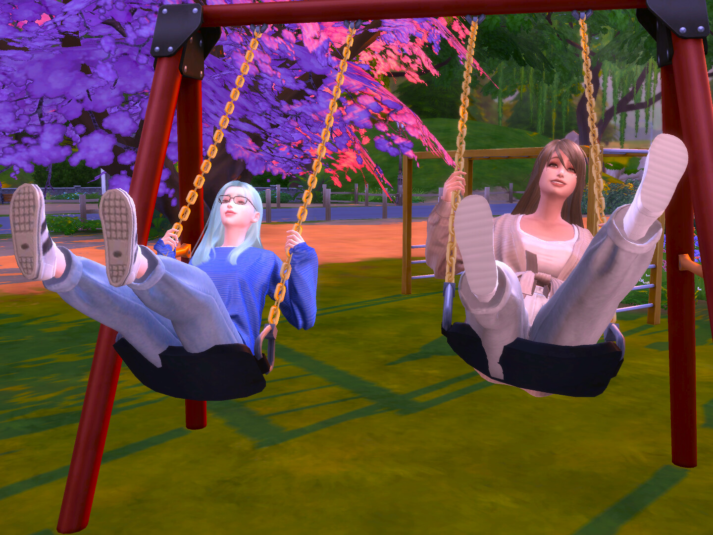 夕方になりキッズが帰っていったので空いたブランコに乗る2人。